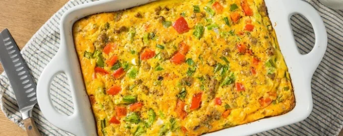 Voor de bereiding heb je worst of ham, eieren, bloem, rijsmiddel, boter, paprika, groene uien, kruiden en een bakvorm nodig.