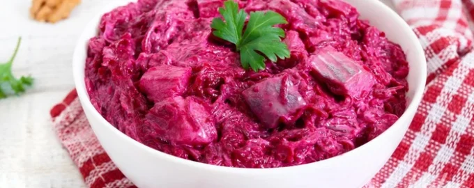 De salade past goed bij zwart brood, aardappelen in de schil of als zelfstandig gerecht. De frisheid van de biet, de sappigheid van de haring en de romige zachtheid van de dressing creëren het effect van “gezelligheid op het bord”. Dit is niet zomaar een salade – het is een nieuwe interpretatie van culinaire nostalgie, die je keer op keer wilt herhalen.